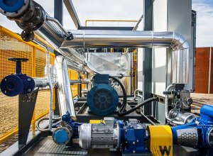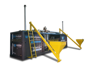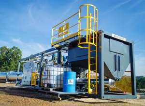 In the first stage, the hot bitumen is pumped at the required temperature (usually around 185ºC) into agitated tank. The thermo-plastic rubber is added and stirred for and equal distribution. Following the mix flows to the mill by gravity. The mix is passed through the mill to physically reduce the thermo-plastic rubber particles in size by mechanical shear, accompanied by a significant input of heat energy. This provides rapid and efficient disintegration of the thermo-plastic rubber particles in the bitumen.